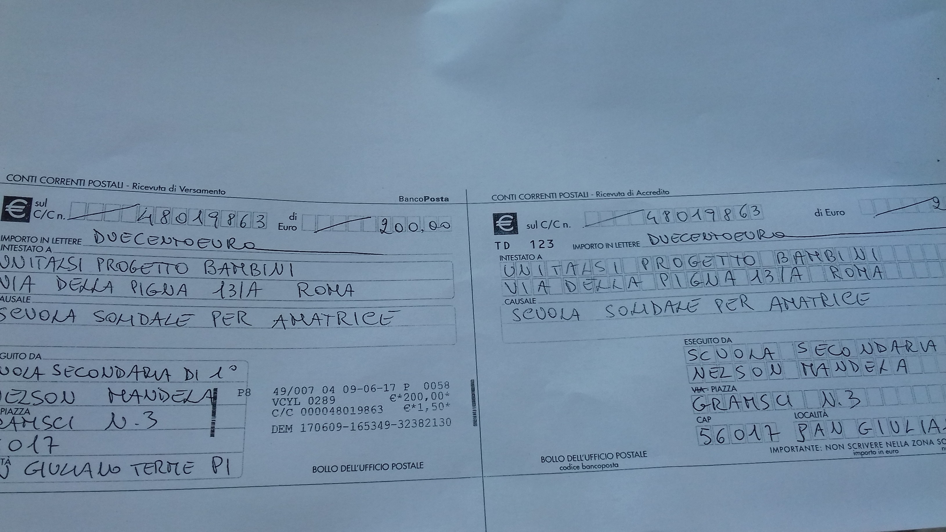 In questo anno scolastico la nostra scuola secondaria di 1° grado “Nelson Mandela” si è impegnata in una raccolta fondi a favore dell’Istituto Comprensivo di Amatrice che è andato completamente distrutto a causa del sisma del 24 agosto 2016. Per dare un aiuto concreto sono state realizzate diverse iniziative; nel primo quadrimestre il mercatino di Natale con vendita di oggetti portati dai ragazzi, dai genitori e dagli insegnanti. Nel secondo quadrimestre sono stati ideati, progettati e realizzati manufatti dai ragazzi del laboratorio “lavoro e creo”, che sono stati venduti in occasione della festa del papà, della mamma, della Pasqua, e per l’evento “Musica Insieme”. La solidarietà di tutti ha permesso di raccogliere la cifra di duecento euro che è stata versata sul progetto “Una scuola per amatrice”. Un piccolo gesto per augurare una rinascita, un desiderio di andare avanti, una vita che si fa strada tra tante difficoltà. “Sappiamo bene che ciò che facciamo non è che una goccia nell’oceano, ma se questa goccia non ci fosse nell’oceano mancherebbe” (Madre Teresa di Calcutta).