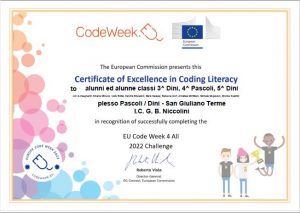 Certificato di Eccellenza in “Coding Literacy” Code Week 4 All 2022